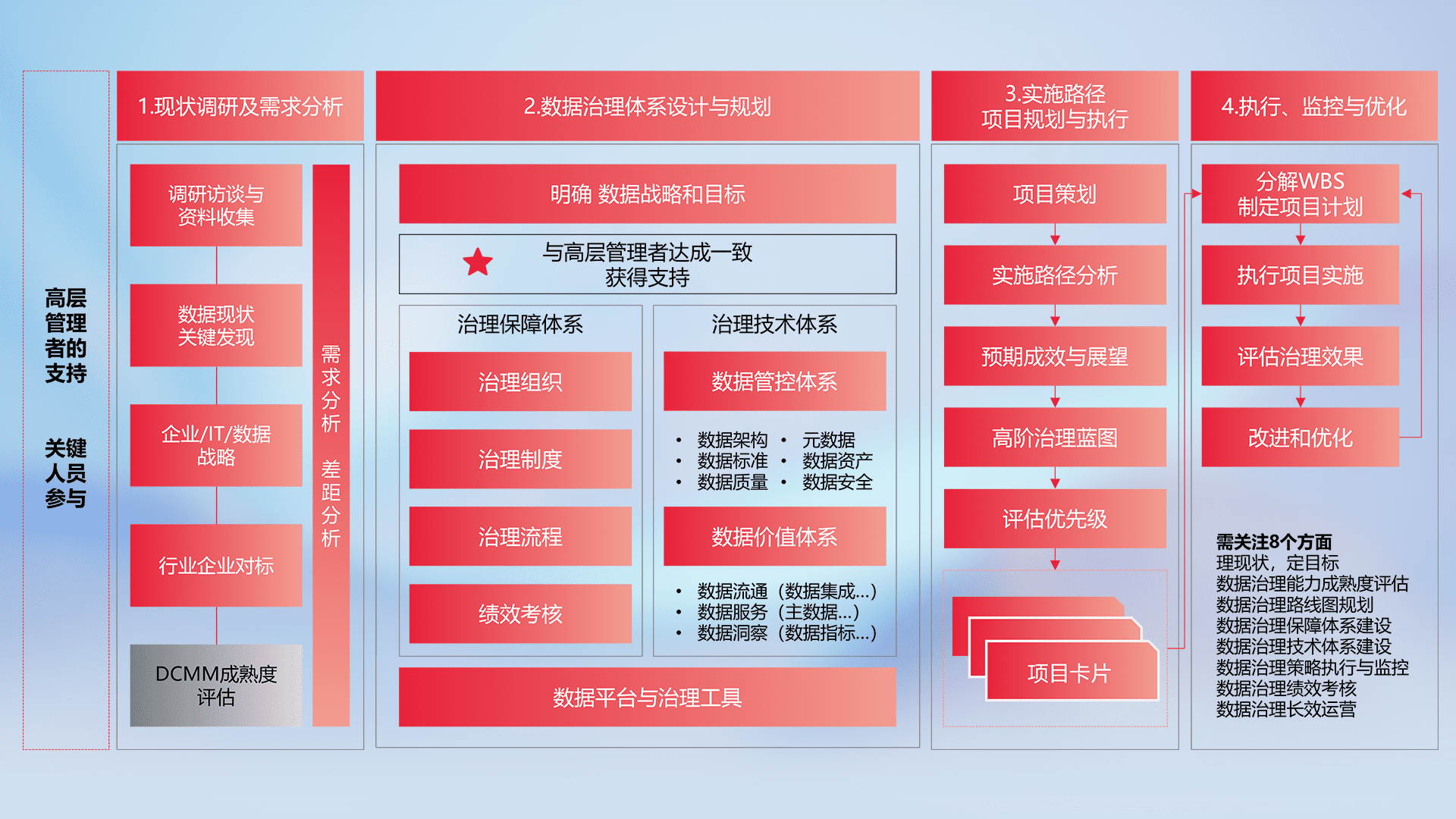 制定并执行统一的数据标准,,,规范数据定义和格式,,,,消除冗余和不一致性,,,实现跨部门和跨系统的数据一致性,,,为企业提供标准化的数据基础。。。